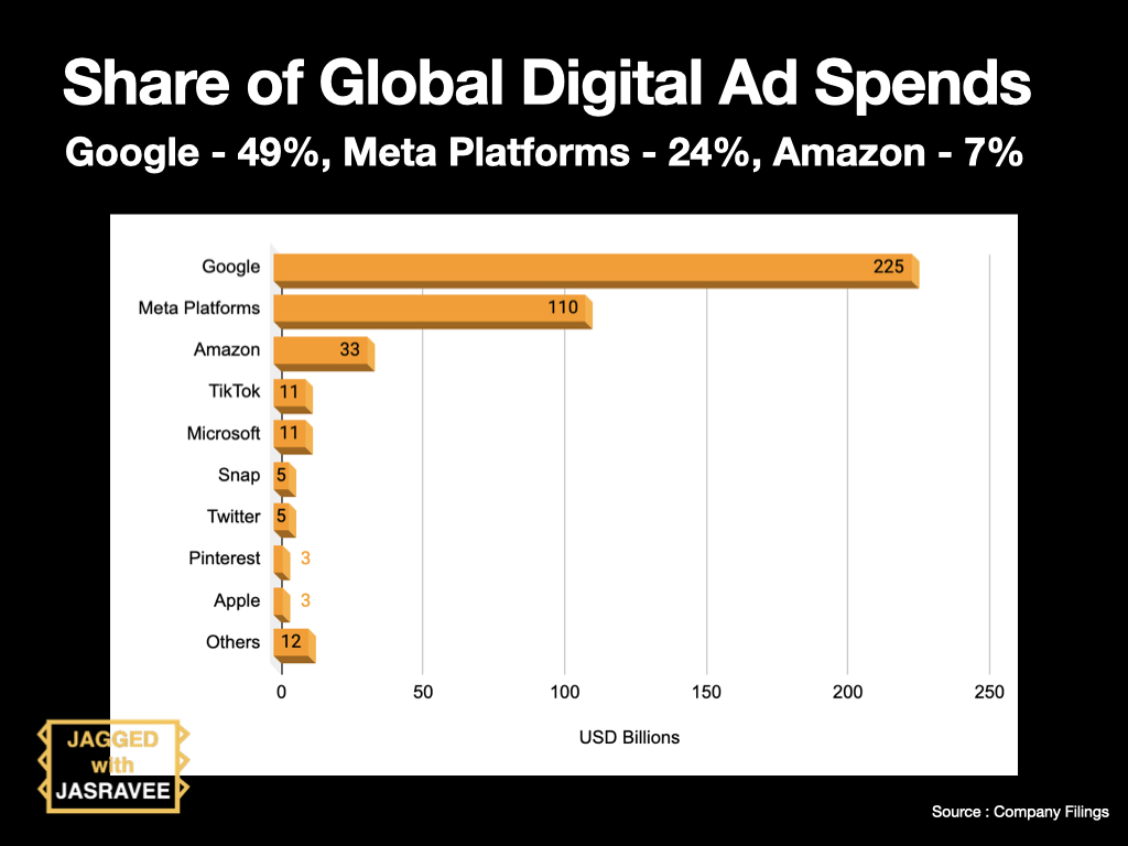 Google with 49% and Meta Platforms with 24% to dominate and capture a significant share of digital global advertising spends. This is often due to a combination of factors such as the size and reach of the platform, the effectiveness and targeting capabilities of the platform’s ad technology, and the overall quality and value of the platform’s user experience.
